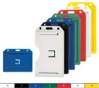 Hold your ID & business cards in out vertical colored 2-sided open faced badge holder.